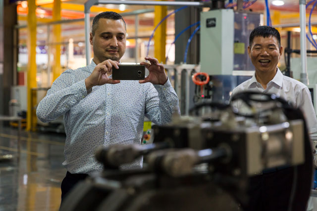 帖木爾.阿魯秋諾夫一行到達公司后就興沖沖地深入生產現場,在董事局主席魯小均,集團副總裁蔡申、新能源公司總經理呂軍煥,和總工辦李銀春博士、劉平宙、朱建錦等工程技術人員陪同下,先后參觀了鋰電池車間、新能源電機車間、智能電動渦旋壓縮機等車間,當看到一條條整齊的生產流水線和先進的自動化檢測裝備時,客人們不由得一邊拍照留影,一邊向陪同人員了解生產技術情況。
